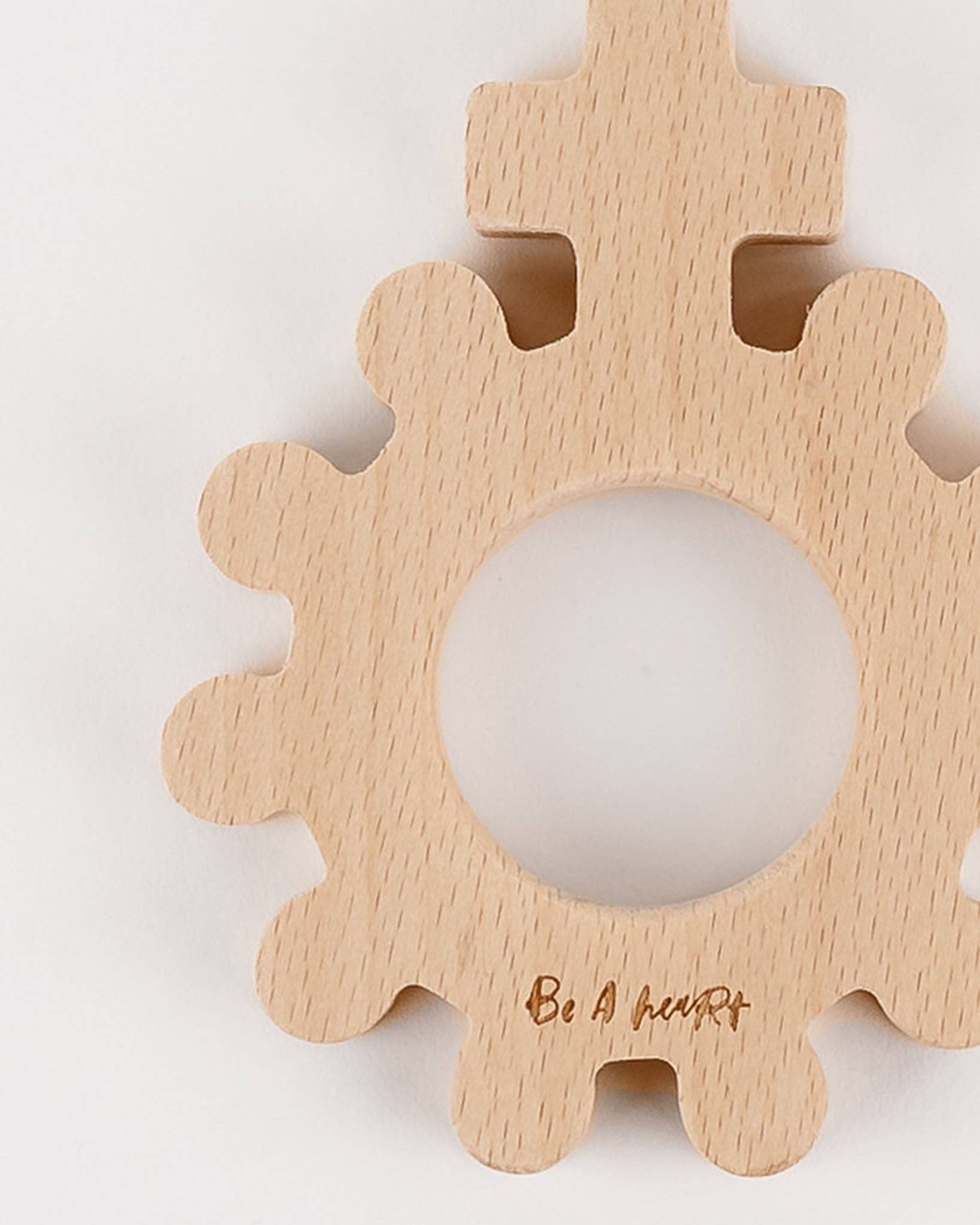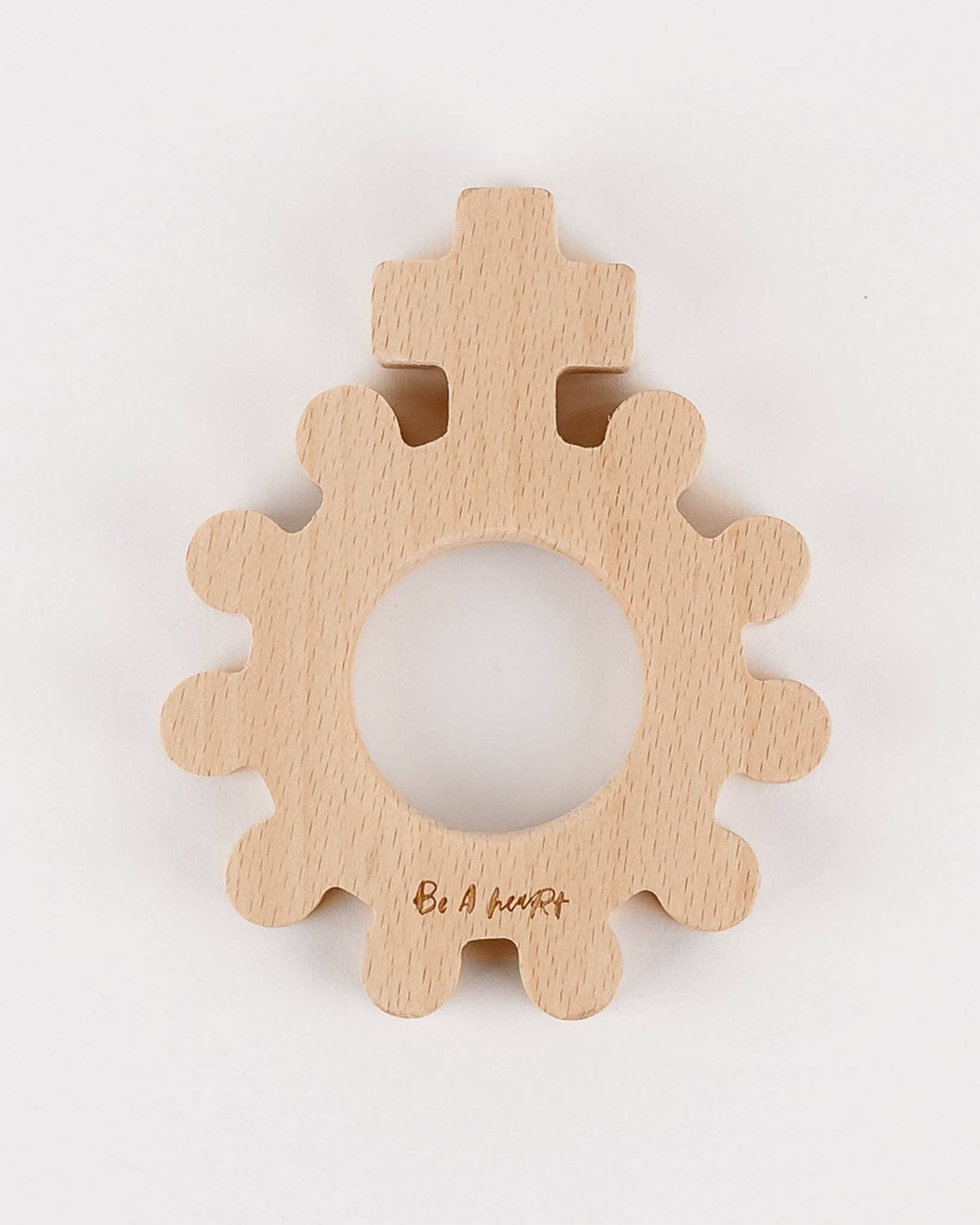 Made of 100% recycled natural beech wood. It is designed like a small pocket rosary that can fit into a baby's hand. Measures approx. 4x5 in.