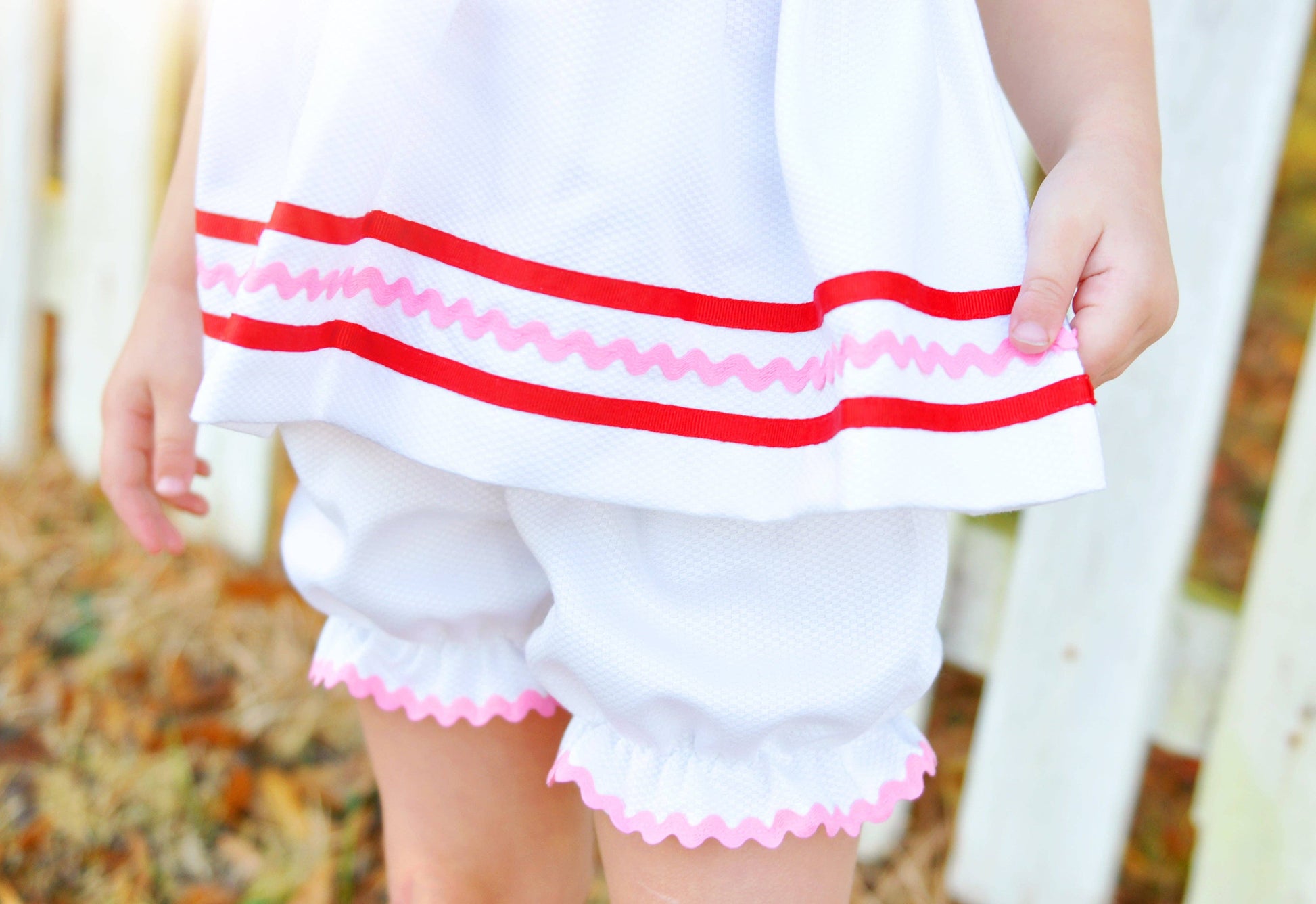 Put your little one in something that'll make hearts flutter this Valentine's Day! This super sweet Be Mine Heart Applique Dress & Bloomer Set is perfect for the occasion. The white pique dress with a full skirt, pink ricrac and polka dot ribbon trim, buttons over the shoulders with heart buttons. The included bloomer has an elastic waistband, elasticized legs, and ricrac trim. So cute! Runs true to size. In stock and ready to ship. 56% Cotton / 44% Polyester Wash in cold water. Tumble dry low or hang to dry. Do not hand wash. No chlorine bleach. *Shirt not included. Add a layer with our Red Knit Puff Sleeve Blouse.