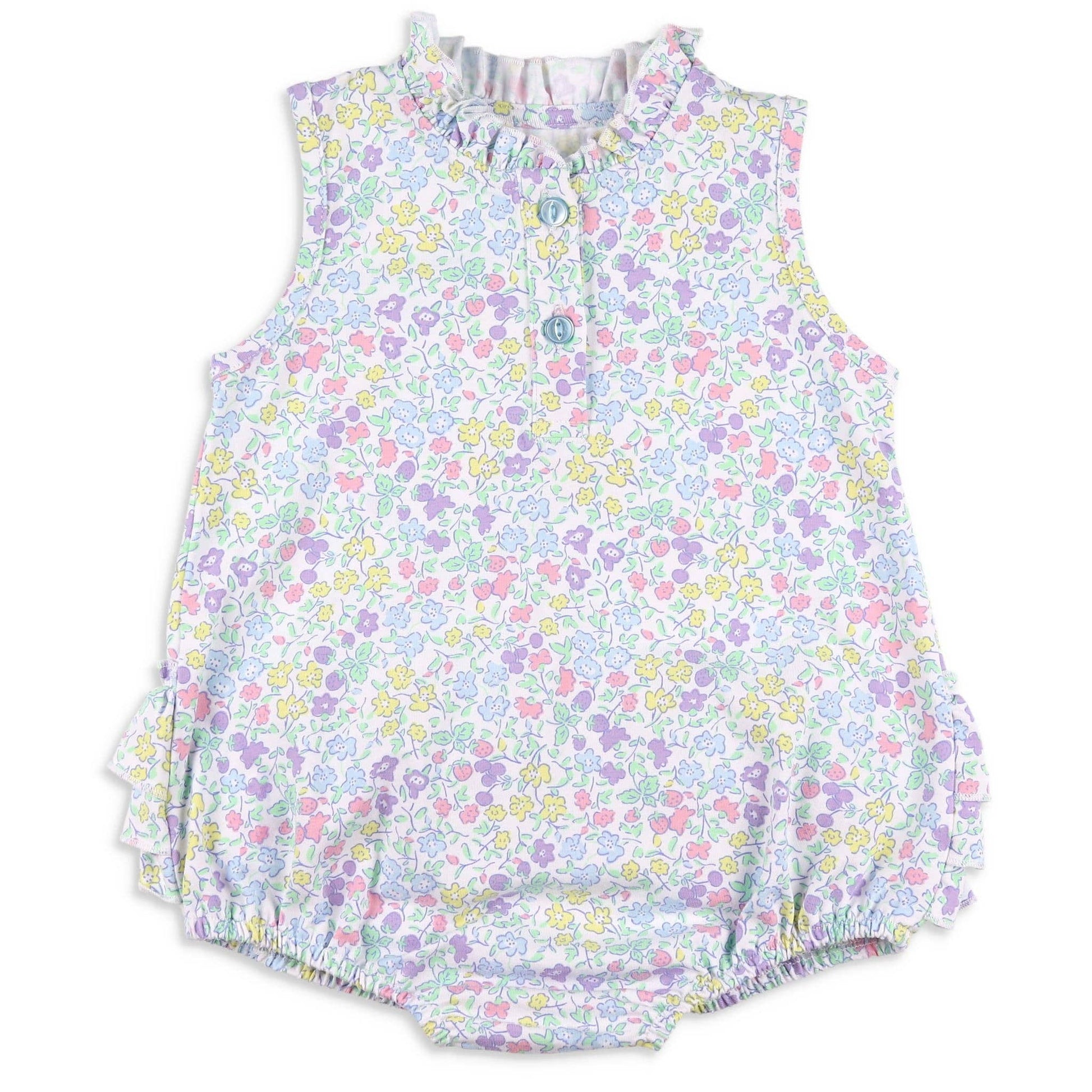 This adorable bubble features soft, cotton knit fabric in a floral and fruit print on white knit fabric, with a sweet ruffle collar, buttons in the front, and three rows of ruffles in the back, all creating a precious picture!
