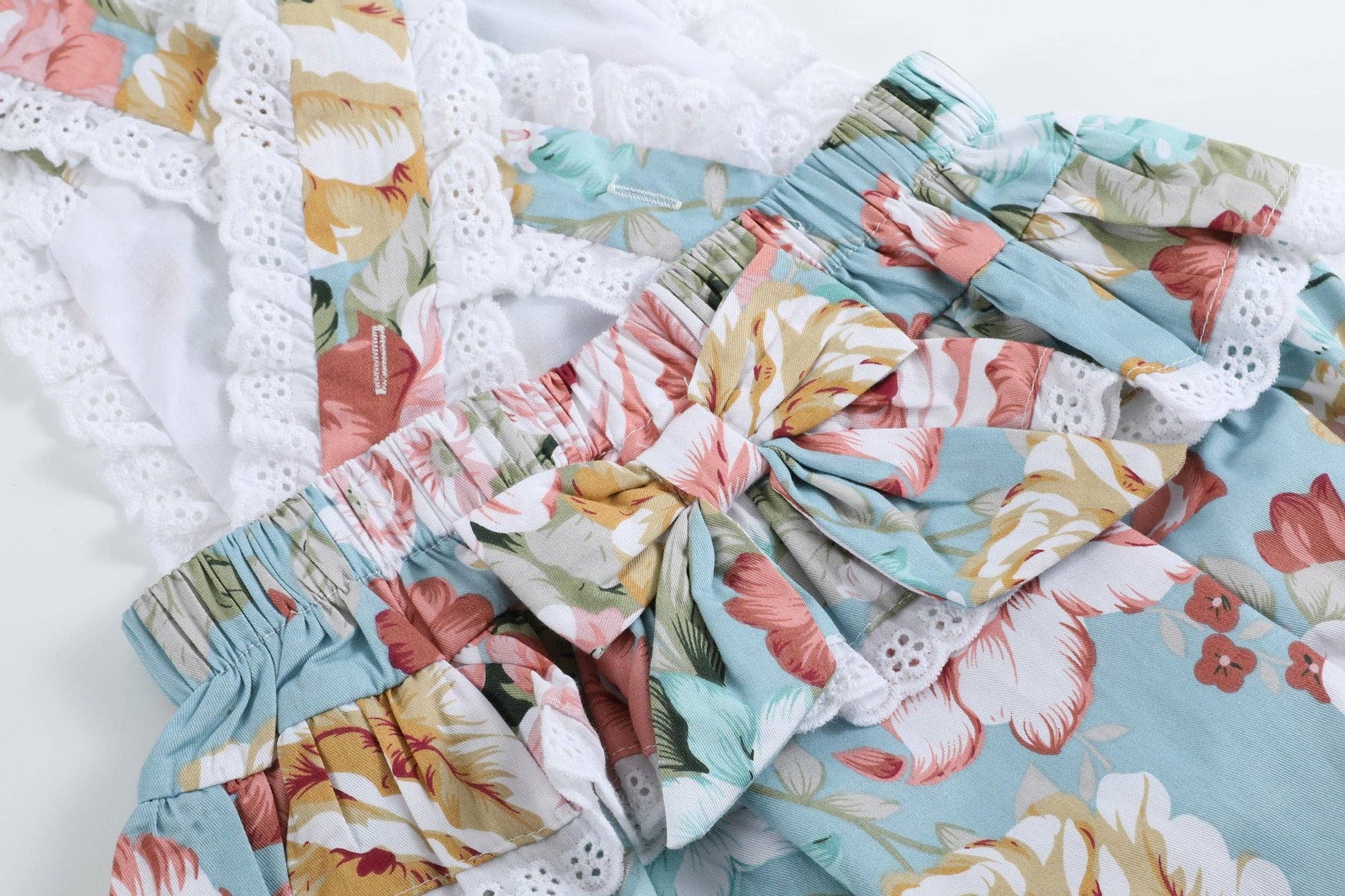Pink & Blue Floral and Lace Bow Ruffle Romper