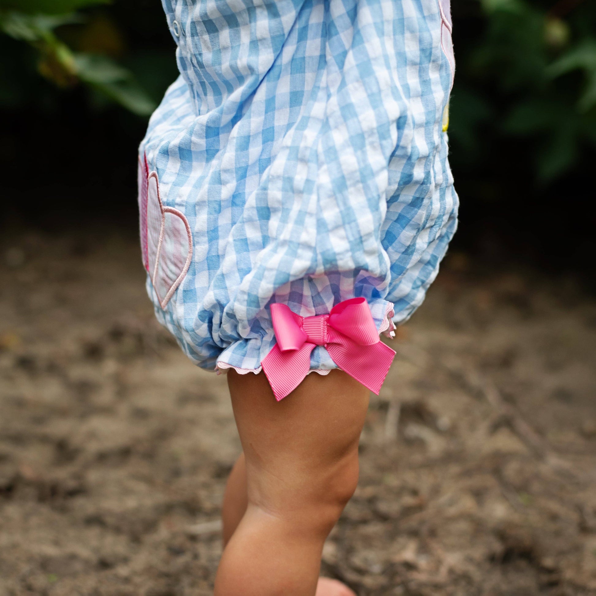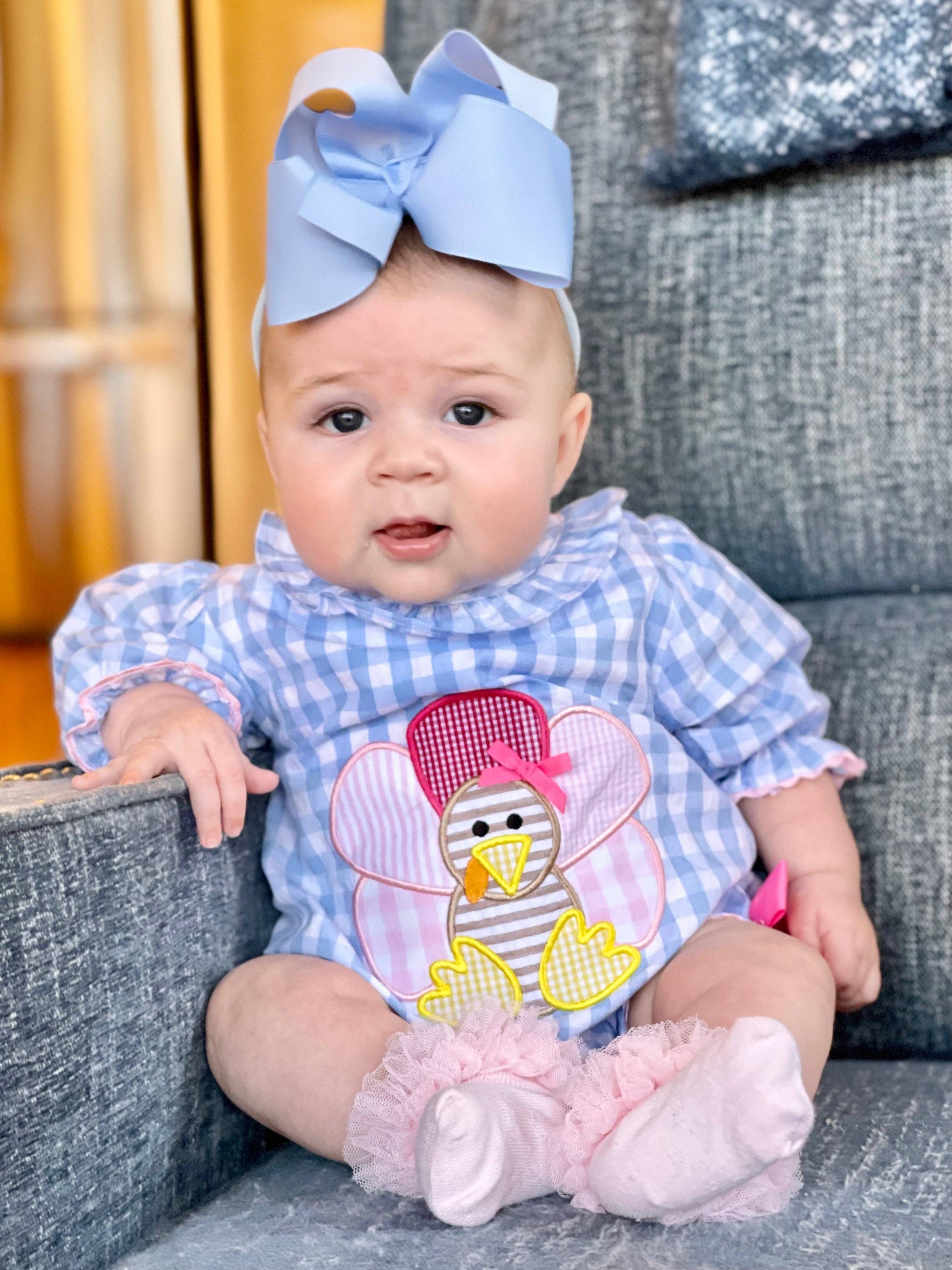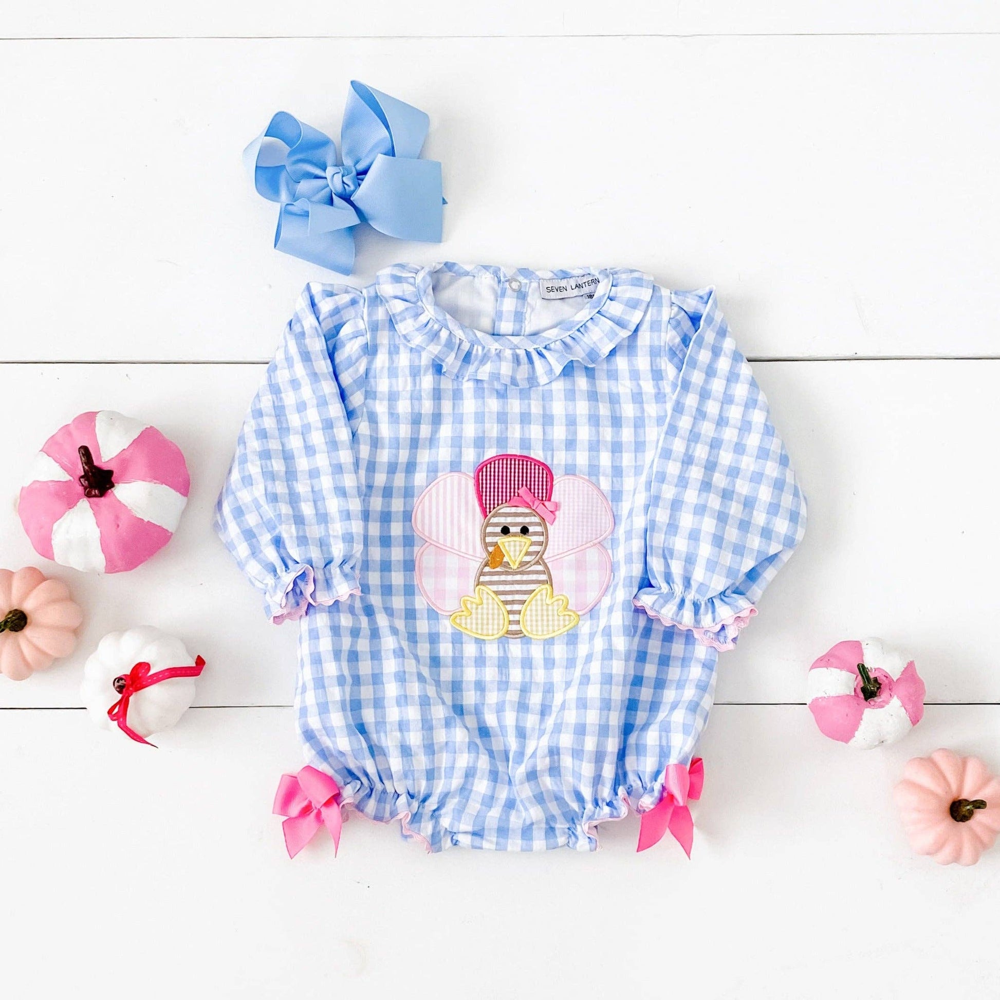The cutest Thanksgiving Bubble features a Thanksgiving turkey applique on the front with applique turkey tail feathers on bum. Accents of ric rac, ruffles, and bows make this bubble over the top cute!