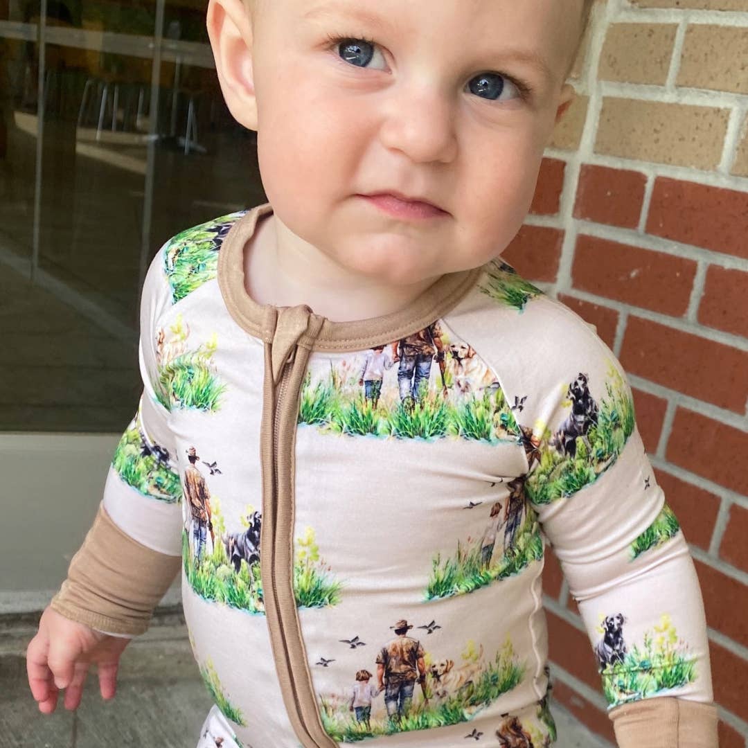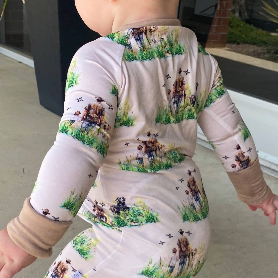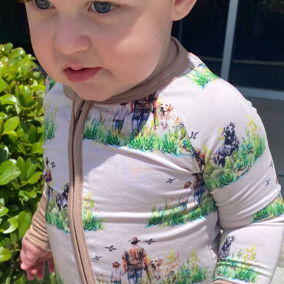 π Transport your child to a world of peaceful slumber with our exclusive hunting-themed one-piece pajamas. Imagine a tranquil marsh scene, a golden lab, a black lab, and a heartwarming father-son duo strolling hand in hand through their adventure. Set against a soothing cream background, these pajamas create the perfect bedtime atmosphere for your little explorer.