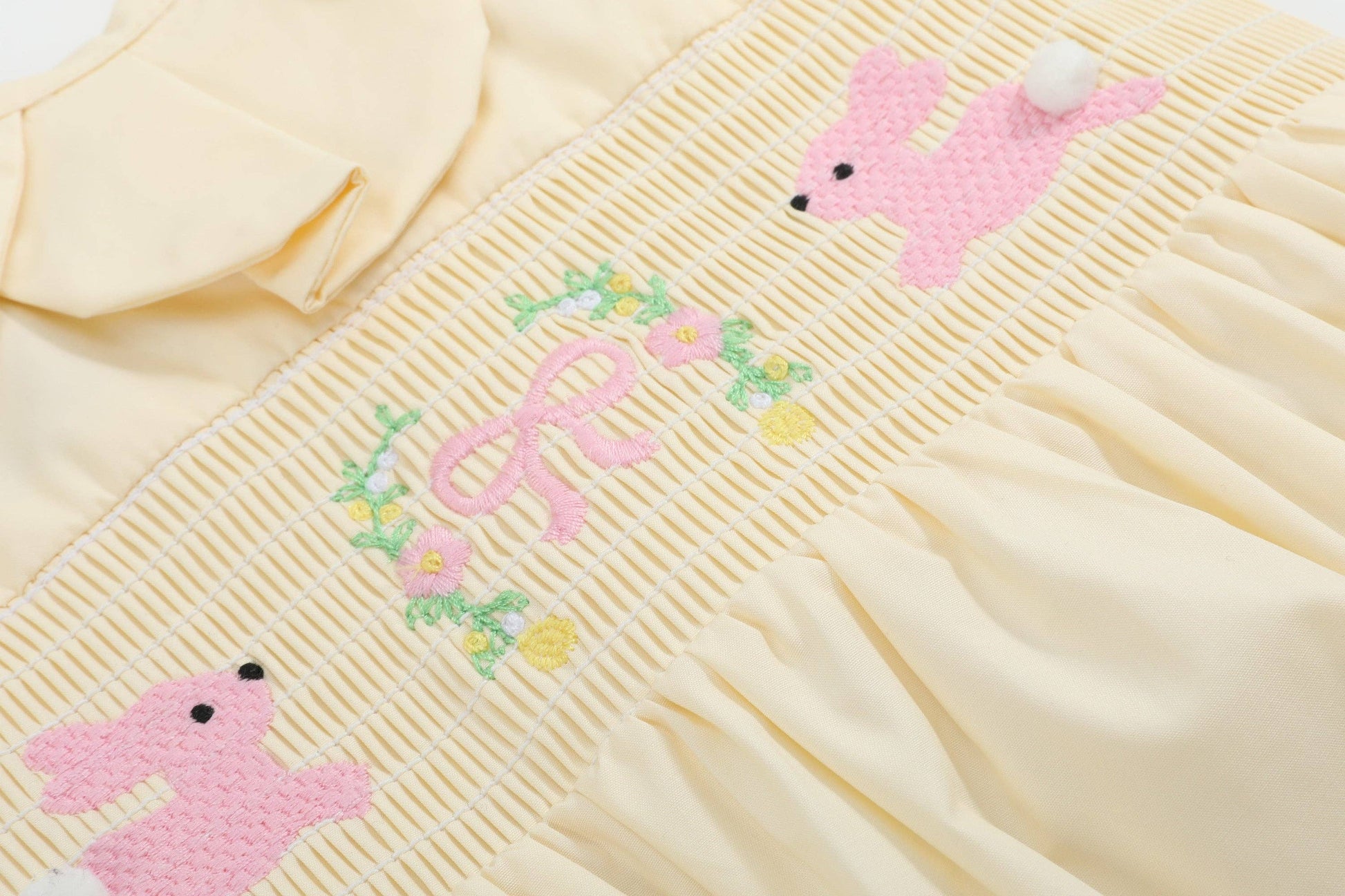 This darling romper is blooming with charm! Made from soft, breathable cotton, it features a delicate petal collar, and smocked detailing across the chest with embroidered bunnies for a timeless, cute touch. With convenient snaps at the bottom for easy diaper changes and a comfortable fit, this romper is perfect for warm-weather outings, special occasions, or everyday play. A lovely choice for baby girls who are ready to shine in style!